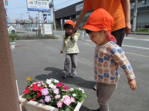 保育園の玄関に飾っているお花をみている様子もあって嬉しく思います?