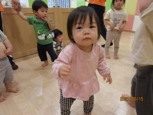 保育士の動きをよく見て、一緒に踊ろうとしている姿があって、