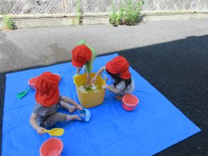 じょうろで水をくんだり出したりして遊んだり、スコップを使って水をすくっていましたよ?
