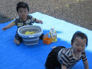 1歳児さんもお水遊びが好きな様子で、自分で頭から水をかけたり、