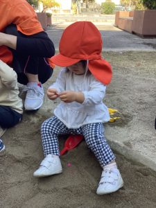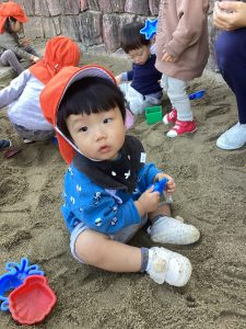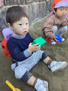 0歳児さんも好きなおもちゃを見つけてお砂をすくったり、