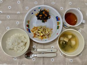 ごはん 味噌汁(わかめ・麩) 豚肉とキャベツのソテー 小松菜とひじきの和え物