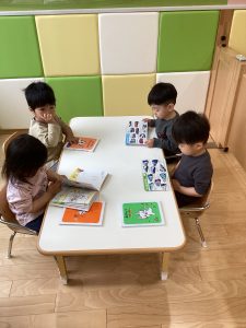机の上に絵本を並べると好きな絵本に手を伸ばして