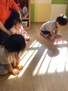 床に反射した模様をとっても楽しそうに