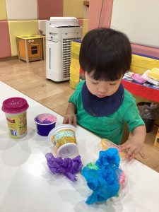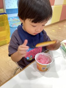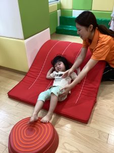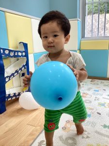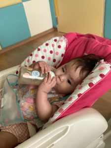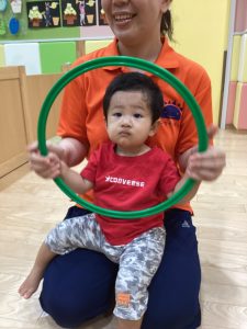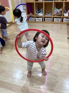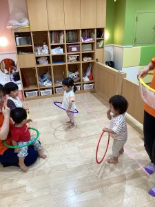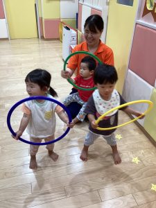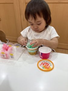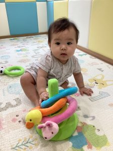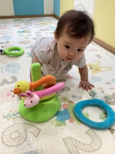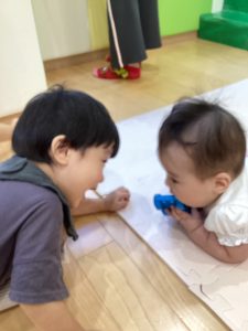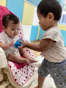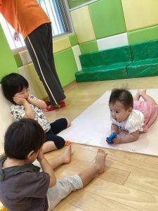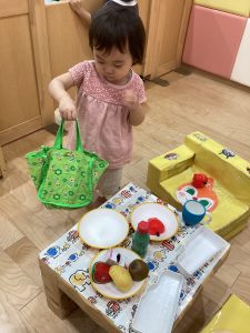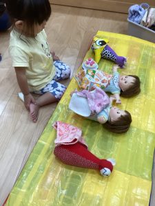 1歳児さんは、ベットにぽぽちゃんを寝かせたり
