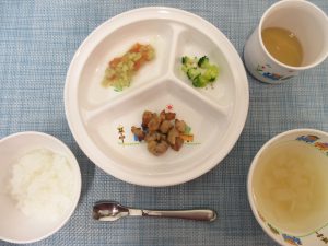 (写真は離乳食後期です。年齢によって盛り付け量を変えて提供しています。)