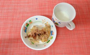 おやつはお好み焼きです!ソースが少し口のまわりについてしまいましたが、ニコニコ笑顔で食べてくれていました☺