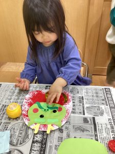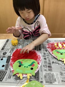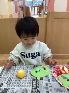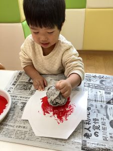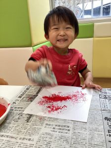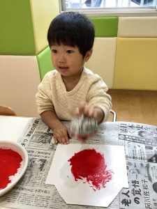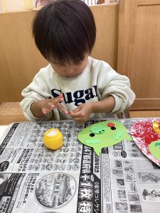 🍏2歳児さんは新聞紙絵の具とのり付けに挑戦しました!