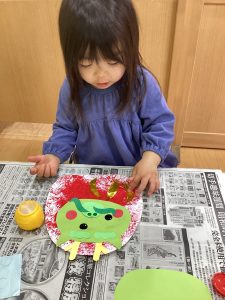 眉毛や目やひげの位置を考えて貼っています🐲
