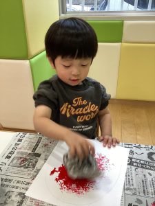 新聞紙でぽんぽんと色付けが上手です🎶
