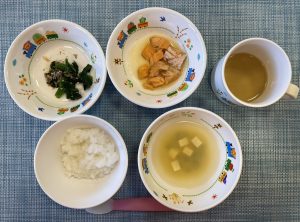 (写真は普通食です。年齢によって盛り付け量を変えて、提供しています。)