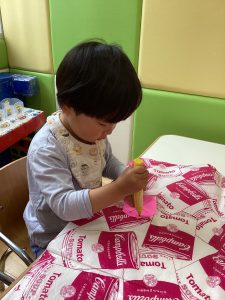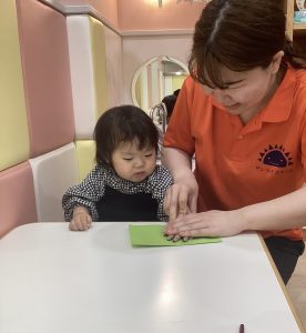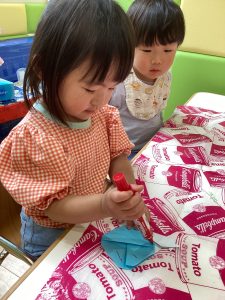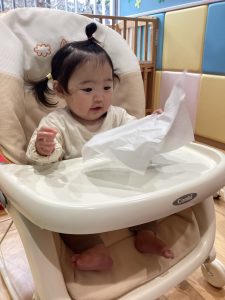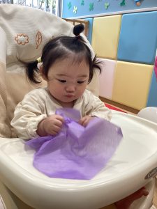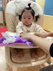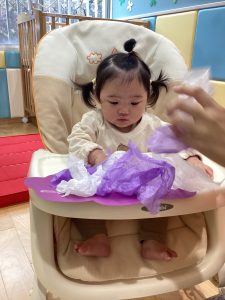 0歳児さんは、お花紙をくしゃくしゃと