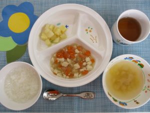 (写真は離乳食後期です。年齢によって形、固さ、盛り付け量を変えて、提供しています。)