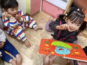 お友だちに絵本を読んであげる姿が