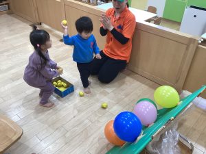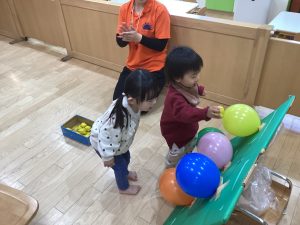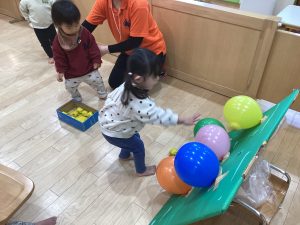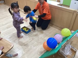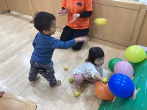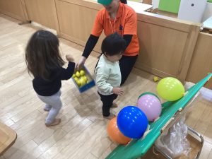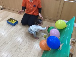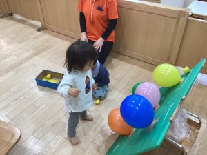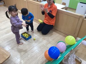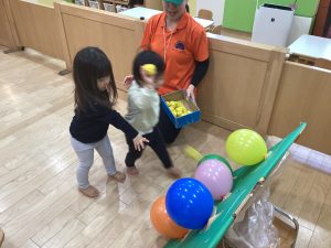 運動遊びでは、風船の的を目掛けて