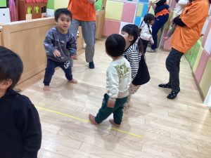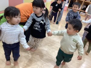 表現遊びでは、お友だちと手を繋いで