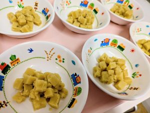 (写真は1.2歳児食です。年齢によって盛り付け量を変えて、提供しています。)