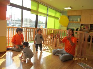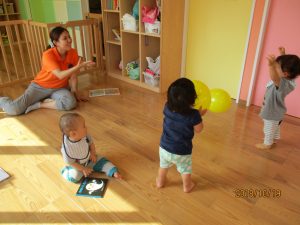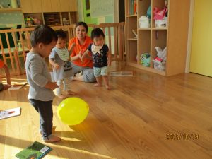 保育者がポンポンと遊ぶ様子を見せると興味を持ち始めて、触り始めたり、また逃げたりとかわいい姿を見せてくれましたよ