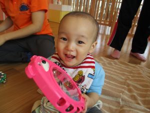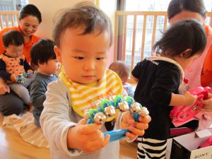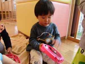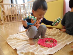 不思議そうに楽器を眺めたり、自分でタンバリンを叩いてみたり、鈴を両手に持って音を鳴らしてみたりと、音に興味を持って楽しんでいましたよ![]()