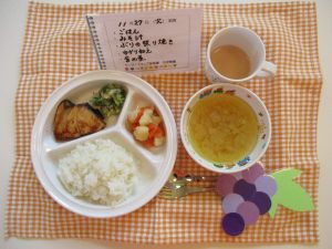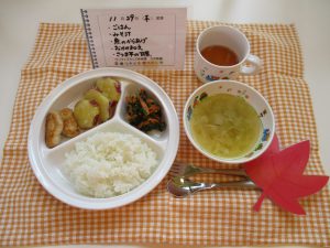 *ごはん *みそ汁 *魚のから揚げ *おかか和え *さつまいもの甘煮