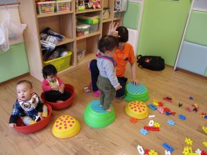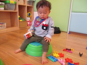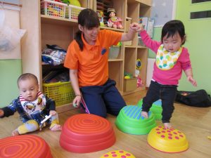 0歳児・ももぐみさんはブロックや平均台を出して遊びました