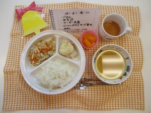*ごはん *みそ汁 *マーボー豆腐 *ベーコンポテトチーズのせ *みかん