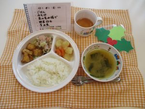 *ごはん *みそ汁 *さばの竜田揚げ *野菜炒め *含め煮