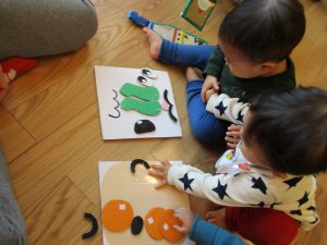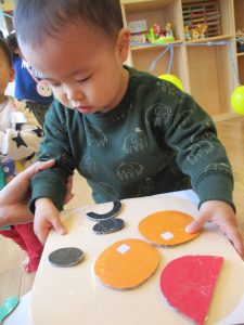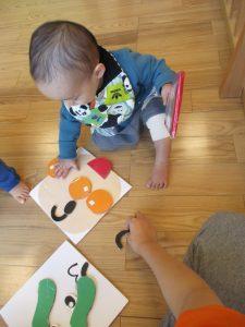 子どもたちの好きな“ワンワン”と“アンパンマン”の福笑いにみんな興味津々![]()