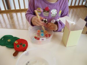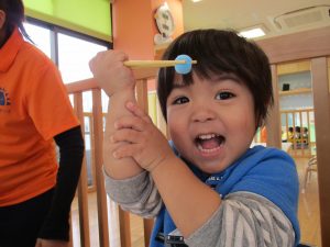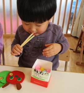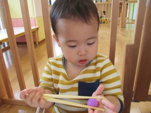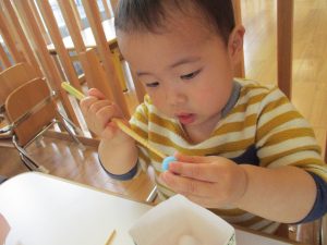 途中からはおままごとにかわり、箸を使って料理をしたり、食べる真似をしたりして楽しんでいましたよ![]()