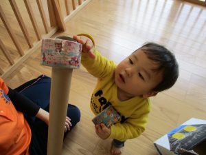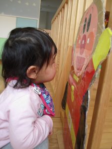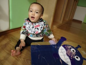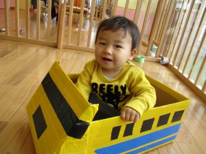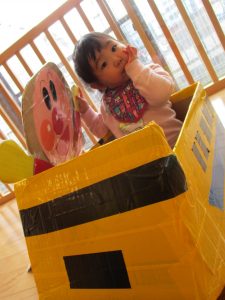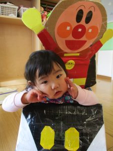 いつもは段ボールにくっついているアンパンマンとバイキンマンが今日は外れていて、一緒に電車に乗ったり、連れて歩いたりと一緒に楽しんでいましたよ![]()