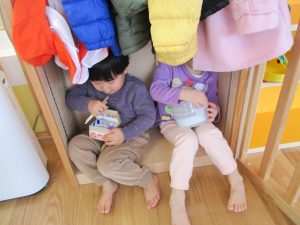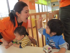 保育園の室内は日差しでとっても暖かく、子どもたちと一緒に体を動かしていると暑くなってくるほどです![]()