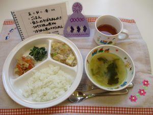 *ごはん *みそ汁 *豆腐のそぼろあんかけ *切り干し大根の煮物 *ほうれん草のマヨドレ和え