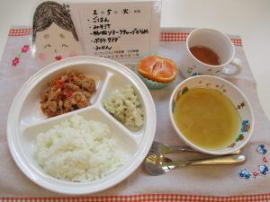 *ごはん *みそ汁 *ツナポテトサラダ *豚肉のケチャップソースからめ *みかん