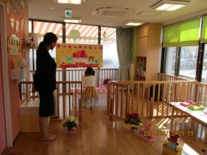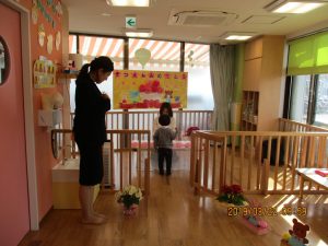 時間になって2歳児クラスのお友だちが登園しましたが、2歳児クラスのお友だちも、出迎えた保育者を見て、“キョトン”![]()