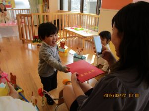 卒園証書を受け取り、お母様・お父様の方へ![]()