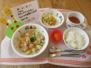*ごはん *チキンクリームシチュー *キャベツの味噌ドレサラダ *みかん缶