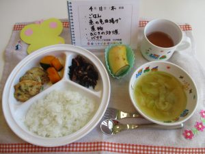 *ごはん *みそ汁 *魚の竜田揚げ *ひじきの炒り煮 *かぼちゃの煮物 *バナナ