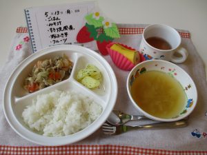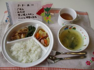 *ごはん *みそ汁 *鶏のマーマレード焼 *サラダ *フルーツ
