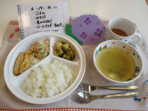 *ごはん *みそ汁 *豚肉の甘酢炒め *おかか和え *フルーツ