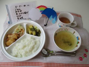 *ごはん *すまし汁 *とり肉のみそ焼き *ソテー *きゅうりのゆかり和え *バナナ