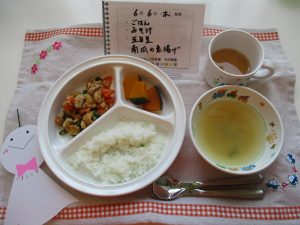 *ごはん *みそ汁 *五目豆 *かぼちゃの素揚げ 【離乳食】 *全粥 *煮豆腐 *煮か...