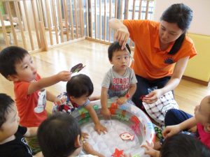 7月も半ばに入りますが、梅雨空が続き、保育園でもなかなか水あそびができずにいます