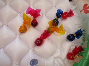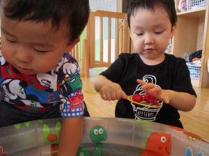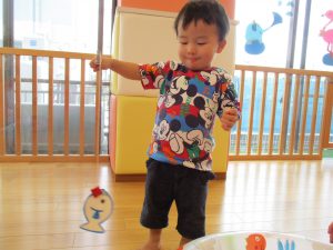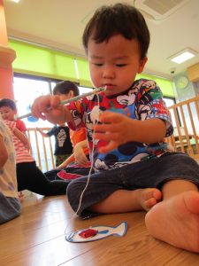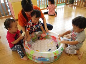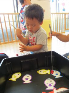 室内で夏の遊びを楽しもうと、みんなで魚釣りボールプールで遊びました