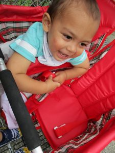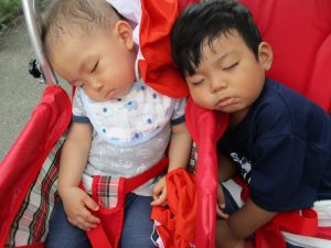 湿気で汗ばんでしまう時期ですが、散歩車でゆっくりと散歩するのは心地良いようで、可愛いこんな姿も