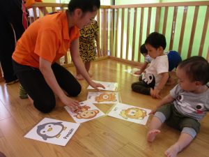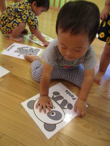 英語と動物の描いてある絵札を子どもたちに見せて、