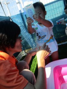 日よけにシャワーの水をかけて、上から水が落ちてくるようにすると、みんな大はしゃぎ