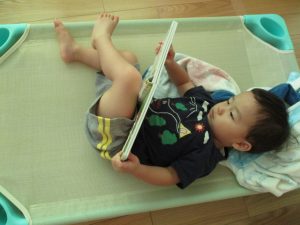 午睡の時間は、暗くするとすぐに眠っていく子や、体力がついてきてなかなか寝付けない子と様々ですが、眠れない子は眠くなるまで静かに絵本を読んだり、保育士と小声でお話したりして過ごしています