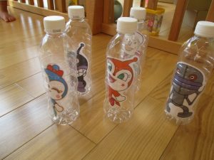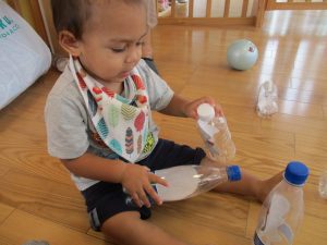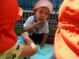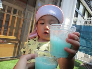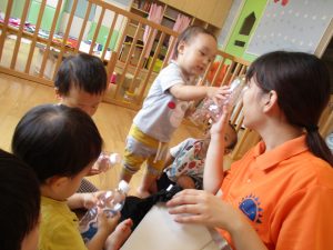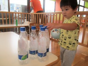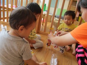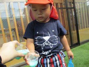 園庭での色水遊びでは、色水を混ぜてとってもキレイな色の水ができあがりましたよ![]()