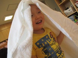 室内では・・タオルケットのリンボーダンス![]()