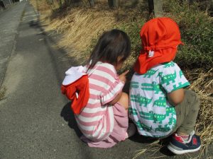 朝のおやつを食べながら、『今日はお花を見つけに行こうか何色のお花があるかな?』と保育士が話しかけると、『赤と、白と、ピンク』と楽しみな様子で返事が返ってきましたよ